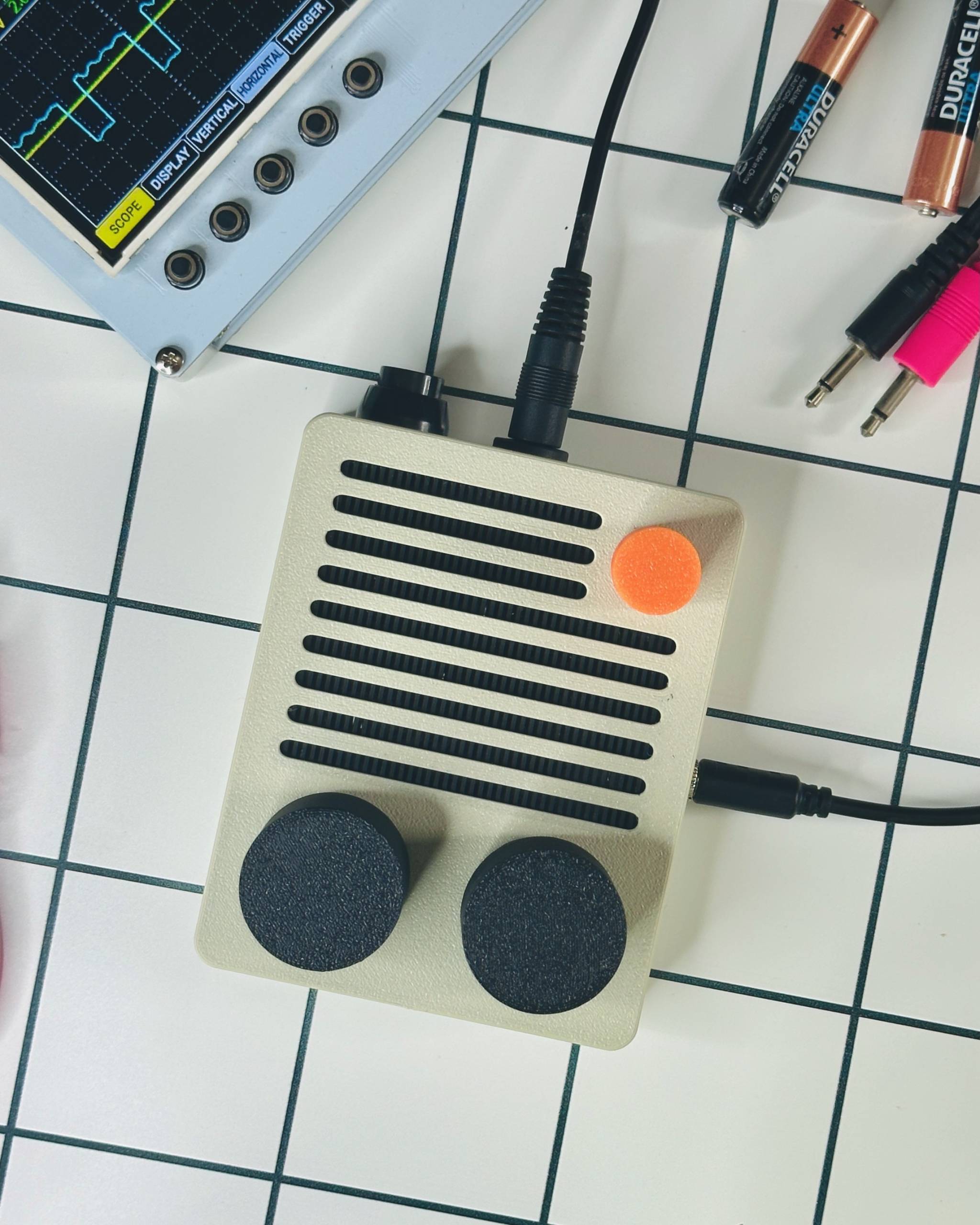 Art Object, Sound machine, Prototype N556 Timer IC stepped toned circuit, speaker, line out, custom case/enclosure, 3D printed PLA 100mm x 80mm x 30mm Metadata 33 - ll-05 2025-10-02 [ art object ] Metadata 33 - ll-05 2025-10-02 [ art object ]